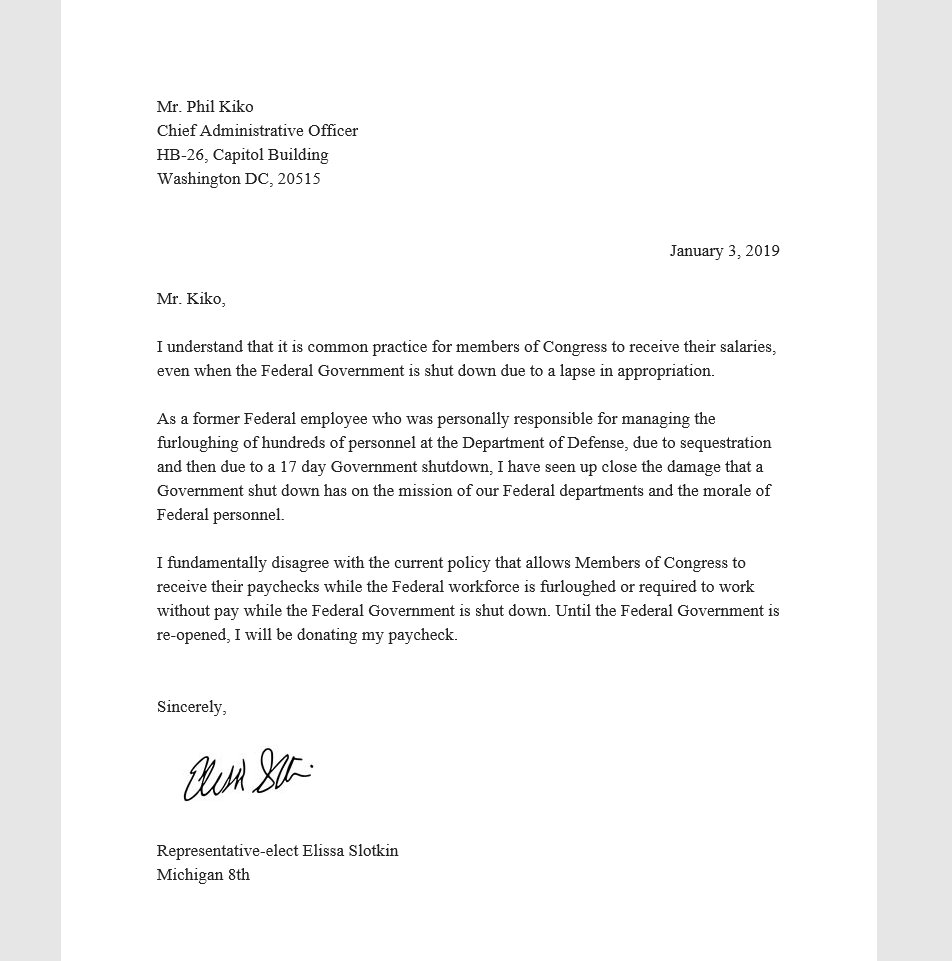 That's putting your money where your mouth is Rep Slotkin, and putting your principles into action. Thank you. Can this be made a condition for Congress and POTUS for any future shutdown?