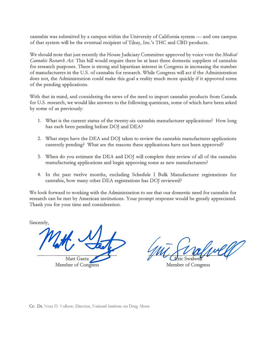 Cannabis needs to be swiftly & completely removed from the Controlled Substances Act. Any more wasting time on this issue will continue heart ache and pain on one side of the nation while others are currently banking billions. Blatant injustice smacking us in the face everyday.