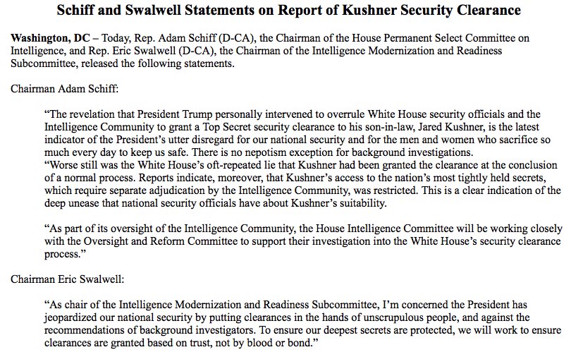 They stripped Brennan & Co of security clearances, falsely accusing them of exactly what Jared is guilty of: using his clearance as a tool for foreign influence/$$$. Congress must act to remove the final approval process from the WH so this never happens again.