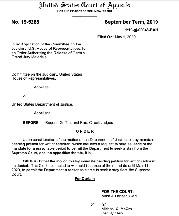 NEW: DC Circuit Court of Appeals orders AG Barr's DOJ to turn over Mueller's grand jury information to Congress. DOJ now has until May 11, 2020, to seek a stay from SCOTUS.https://twitter.com/kyledcheney/status/1256279766438739968 …