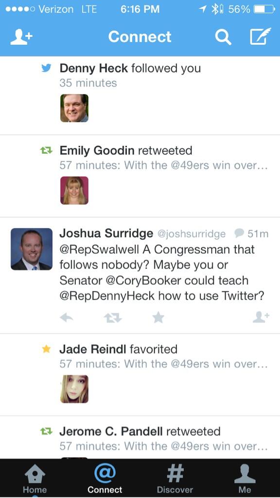 @RepSwalwell A Congressman that follows nobody? Maybe you or Senator @CoryBooker could teach @RepDennyHeck how to use Twitter?
