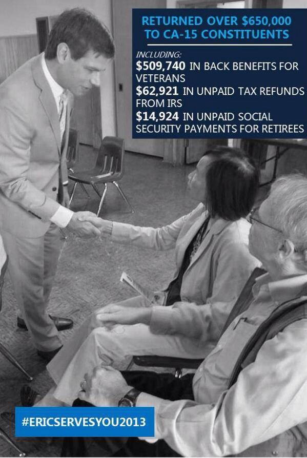 My office returned over $650,000 to #CA15 constituents this year. #ericservesyou2013pic.twitter.com/gSTpQMJXRE