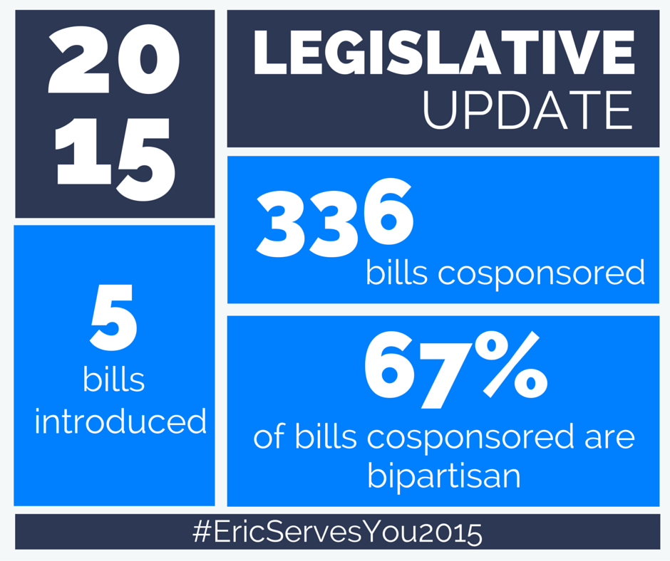 2015 legislative update: 5 bills intro'd & 336 cosponsored. 67% cosponsored bills are bipartisan. #EricServesYou2015pic.twitter.com/alLVSBGKc9