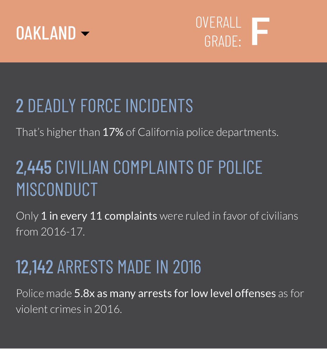 Campaign Zero just released their Police Scorecard. It “evaluate[s] levels of police violence and accountability within California’s 100 largest city police departments.” The departments in the SF Bay Area’s two major cities both got Fs... You talking about the same Bay Area?pic.twitter.com/cUh49IQVkO