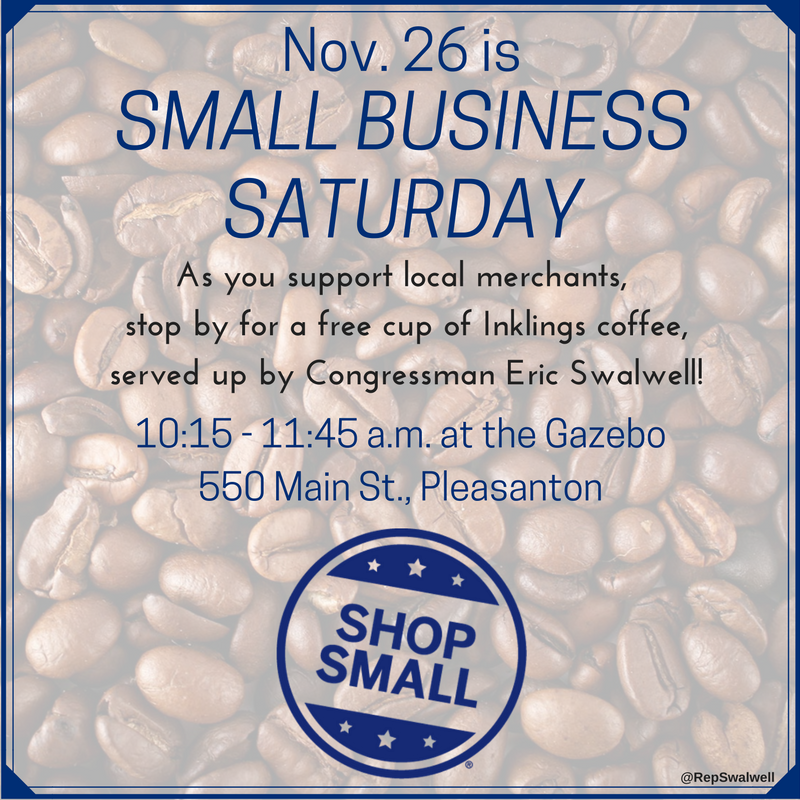 Give local #CA15 merchants some love on this #ShopSmall Small Business Saturday – and come have a free cup of coffee on me in Pleasanton!pic.twitter.com/jcIVbtxqib