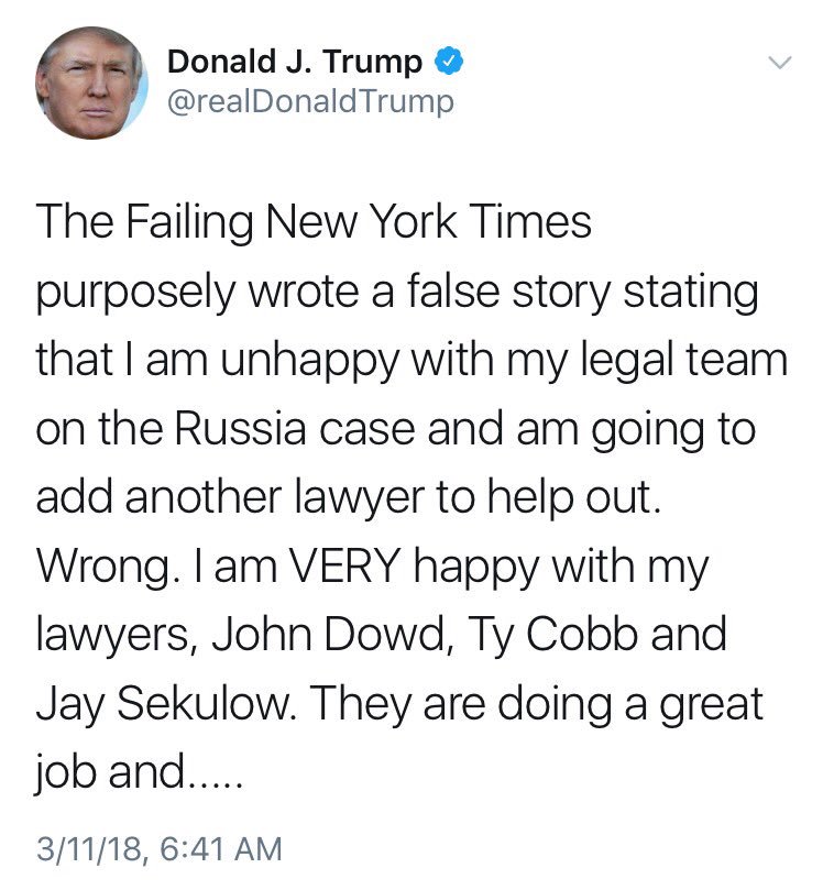 A week later he adds a new lawyer and his #1 quits. Don't ya just hate when that "Failing New York Times" is spot on?pic.twitter.com/7poH4qHYjJ