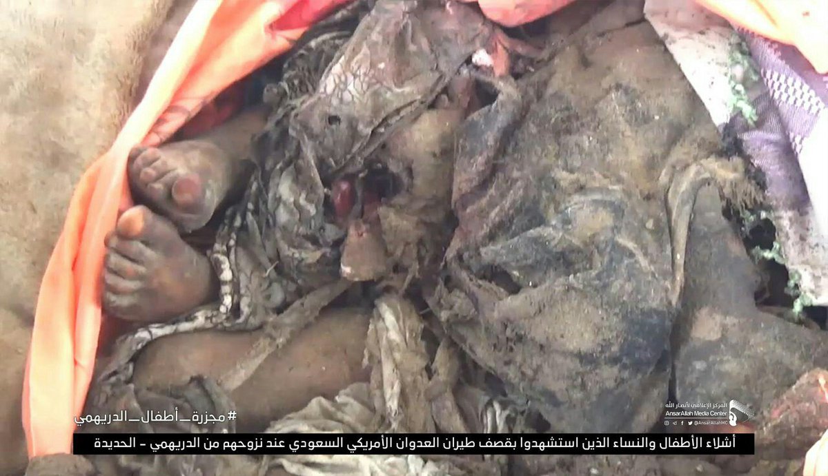 Warning graphic. First photos of aftermath of #Saudi led coalition attack on displaced people in Alduraihim area #Hodeidah #Yemen. 22 children and 5 women were killed. #DurihmiChildrenMassacre pic.twitter.com/YzJOP14nAz
