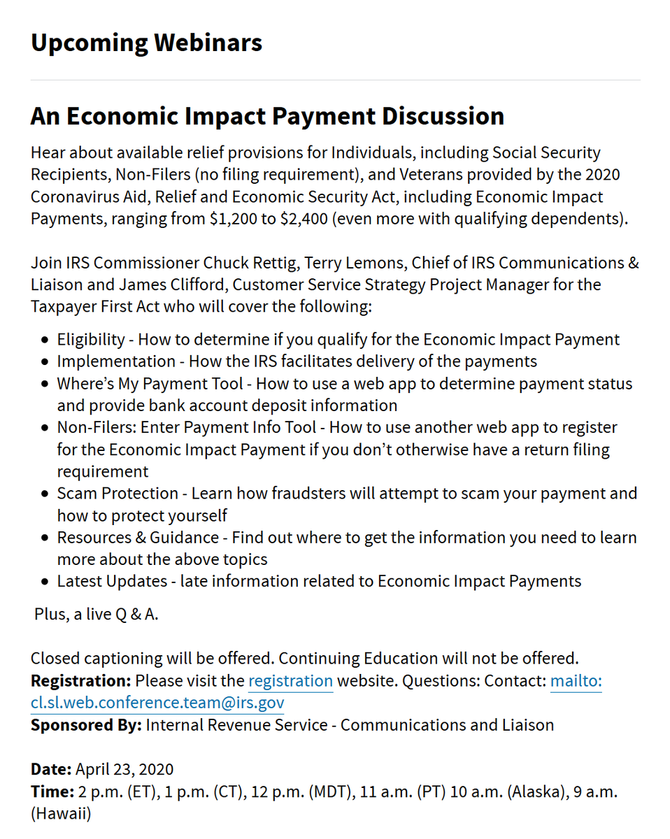 Reminder: @IRSnews will be holding an Economic Impact Payment discussion (with live Q&A) with the American public tomorrow, April 23 at 11 a.m. PT. Pre-registration is required. Visit https://bit.ly/2yBLpFQ  to register.pic.twitter.com/BwROG0qYy9