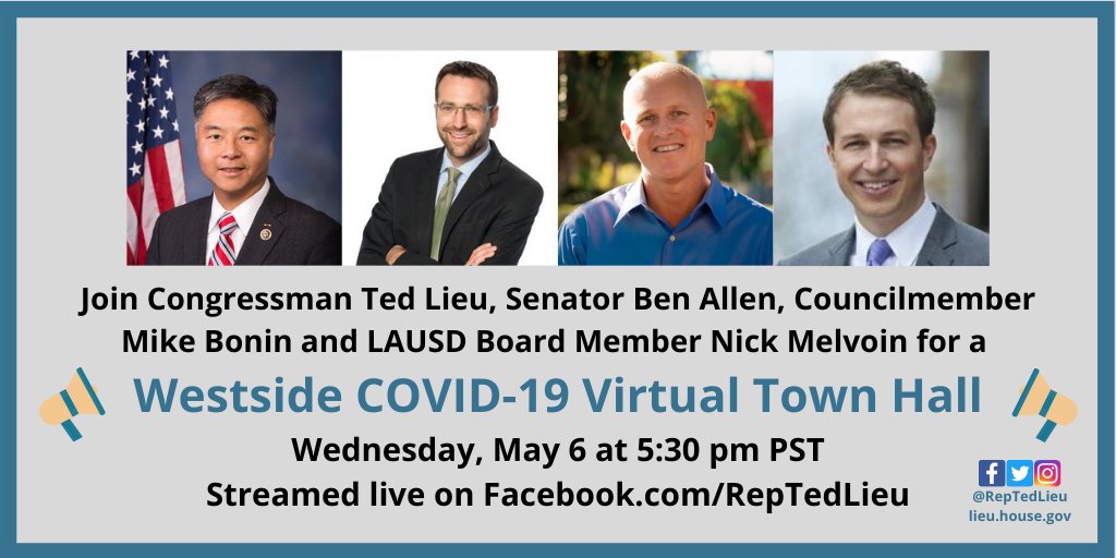 ICYMI: We’ll be joining @BenAllenCA @nickmelvoin @MikeBoninLA for a #COVID19 Resources & Updates Virtual Town Hall for residents of the Westside. Watch on May 6 at 5:30PM PST at http://facebook.com/reptedlieu . Submit a question by responding to this tweet below ⬇️pic.twitter.com/I04oHYDxkD