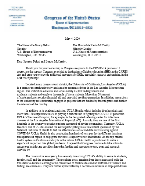 Institutions of higher education such as @UCLA in #CA33 have played a critical role in our fight against #COVID19. We thank leadership for including some of our asks to provide more funding and address issues IHEs and health care providers are facing in the #HeroesAct.pic.twitter.com/q3c52cxGgd