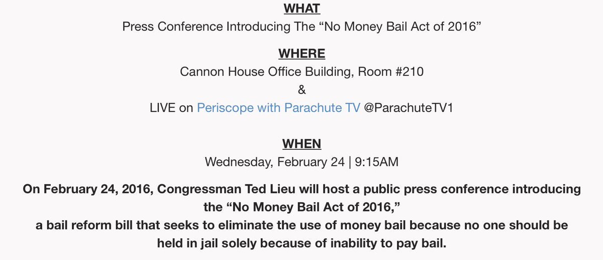 Tune in LIVE tomorrow at 9:15AM ET on @periscopeco as we introduce the #NoMoneyBail Act #CJReform #TalkPovertyhttps://twitter.com/ParachuteTV1/status/702269557235281920 …