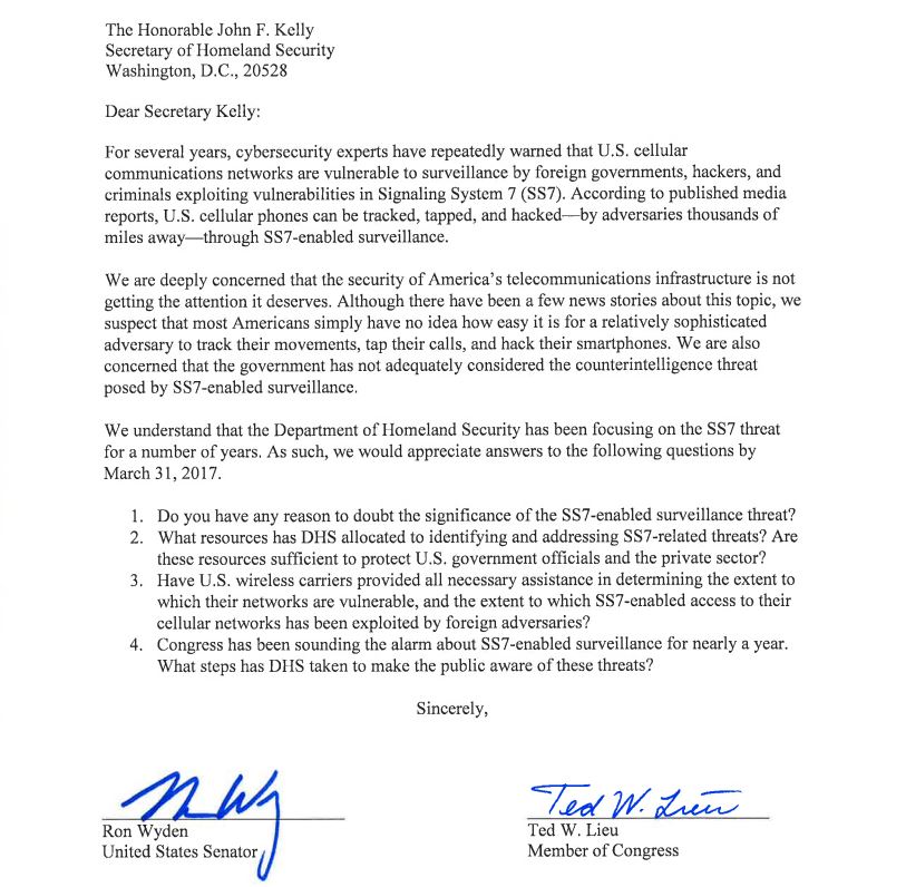 Today, Rep. Lieu & @RonWyden sent a letter to @DHSgov urging them to inform Americans about serious security threats to mobile devices. #SS7pic.twitter.com/nOcAJZhGjM