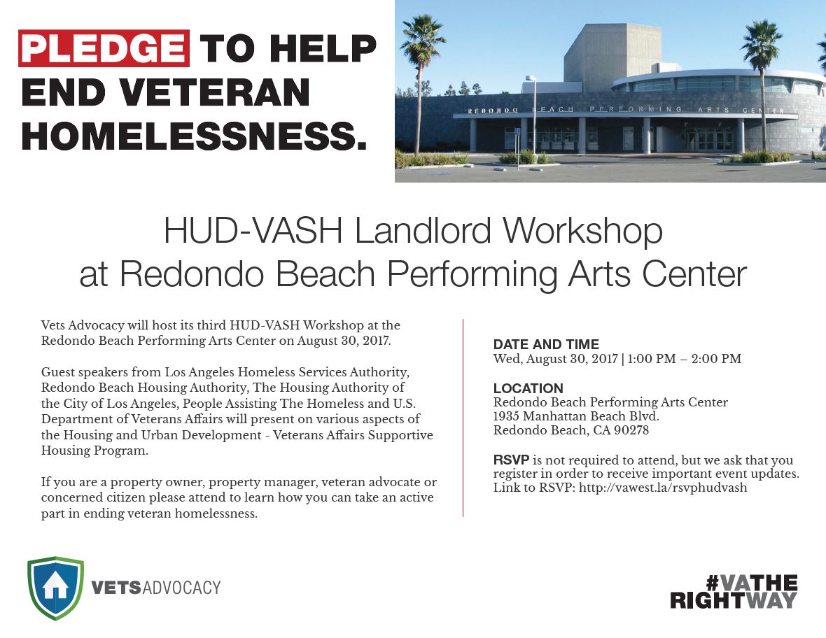 Join @VATheRightWay for a #HUDVASH workshop in #CA33 at @RedondoBeachPAC on 8/30/2017 from 1-2PM. Visit http://bit.ly/2waKhDT for details.pic.twitter.com/le1r3xXkbI