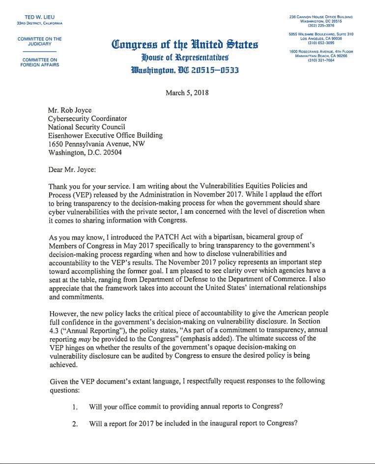 Wrote to the Cybersecurity Coordinator for NSC w/ questions about the process for disclosing cybersecurity vulnerabilities & the Admin’s recently released Vulnerabilities Equities Policies & Process (VEP), a crucial part of our national security. Details: http://bit.ly/2oYHfiZ .pic.twitter.com/MehzH5YmPr