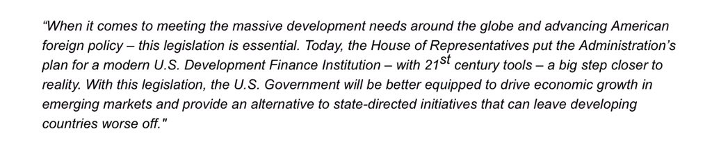 @HouseFloor of#TheBUILDAct - bipartisan legislation by@RepTedYoho@RepAdamSmith@RepEdRoyce - to modernize US development finance,@opicgov Pres & CEO Washburne issued this statement:pic.twitter.com/rng1PxvW8c