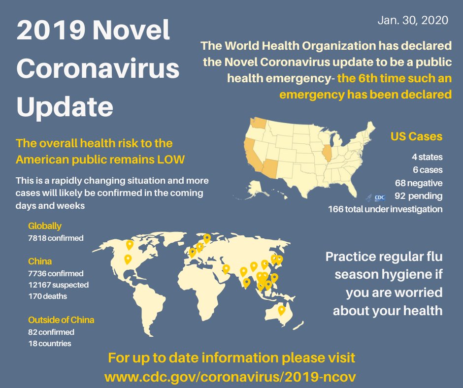Important news: The @WHO has declared the novel #coronavirus update to be a public health emergency. This is the sixth time such an emergency has been announced. The overall health risk to the American public remains low.pic.twitter.com/wHVYds1K2C