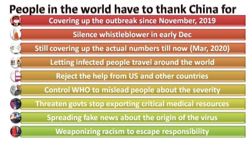 #MakeChinaPay for its censorship, disinformation, delayed response and manipulation to@WHO that caused the current uncontrollable#WuhanVirus pandemic. If authoritarianism in China continues, history will repeat.#ChinaLiedPeopleDied#ChinaViruspic.twitter.com/m7FxGI0Usv
