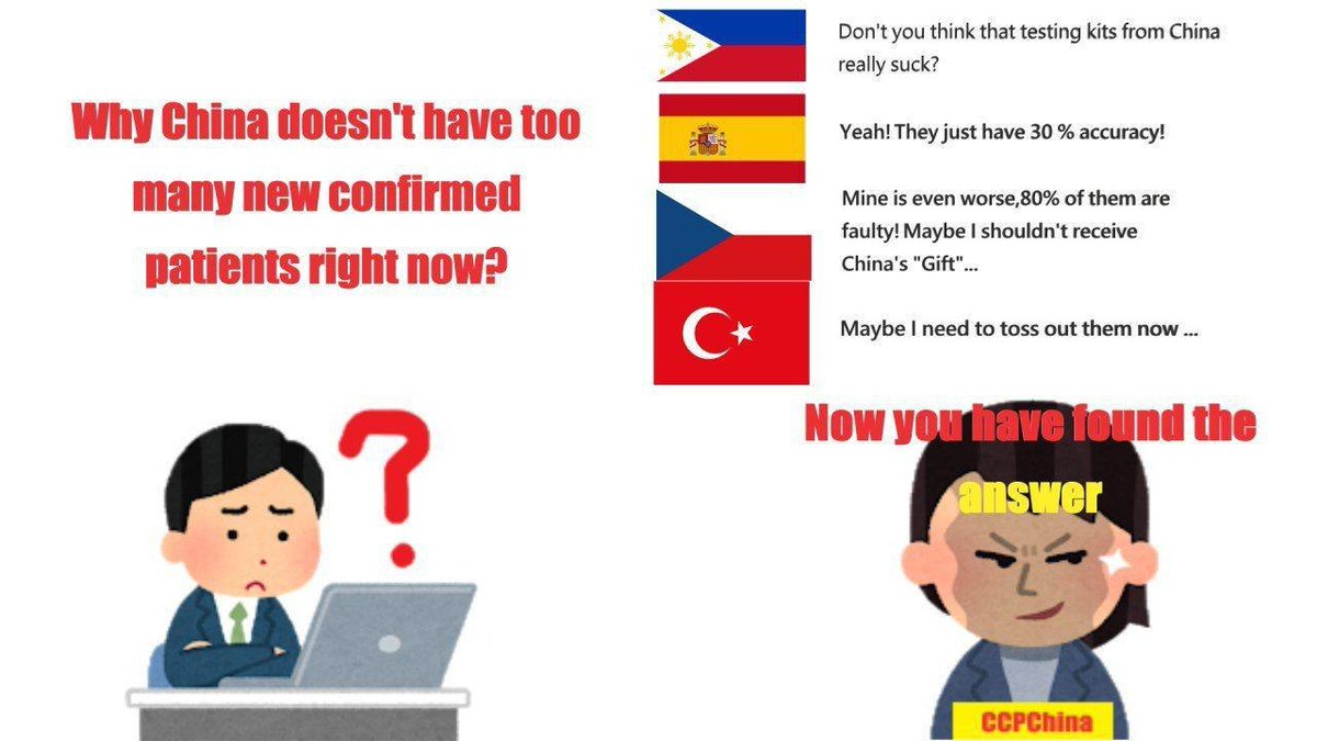 Maybe that's the reason why there're no new cases of #WuhanVirus in the country. Communist China received money but provided faulty goods to other countries. Once again proved how shameless this tyranny is. #ChinaLiesPeopleDied #ChinaVirus #BoycottChina #AnywherebutChinapic.twitter.com/XsaCJHIUMm