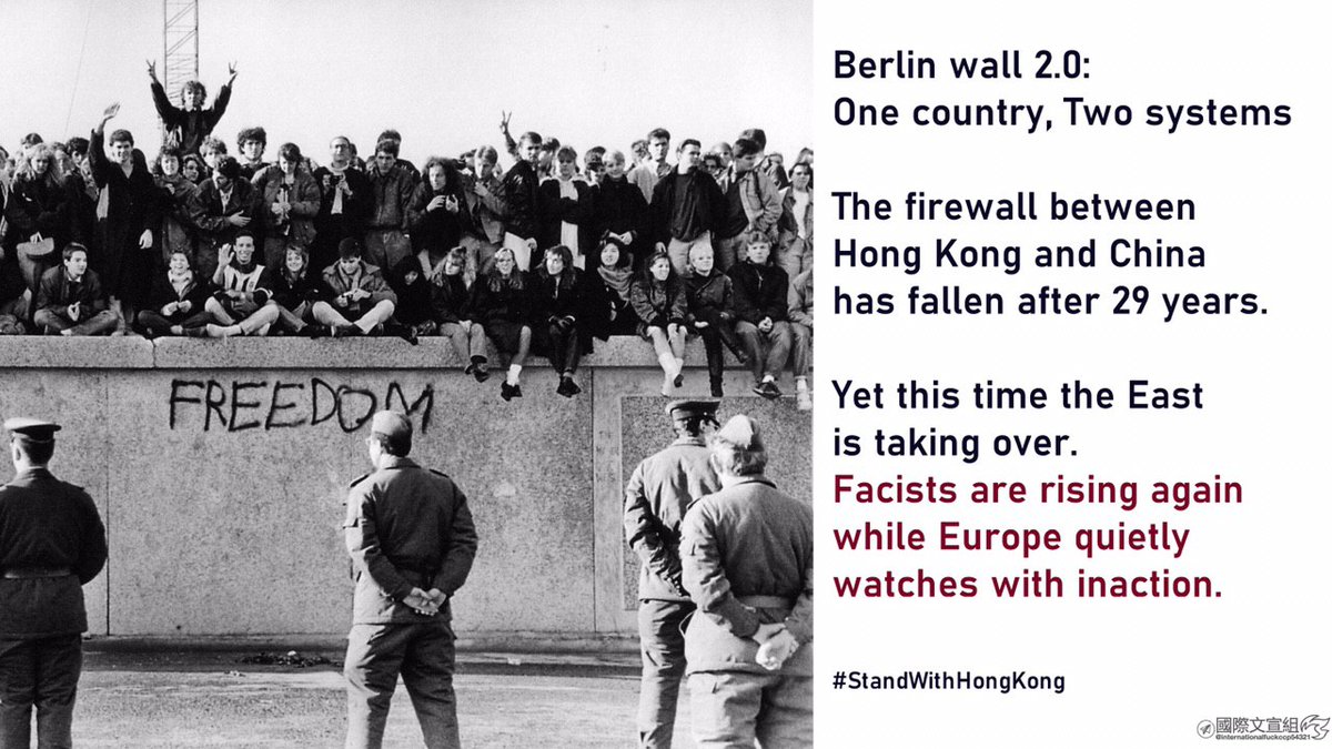 It took years to break Berlin Wall but the Wall was down eventually after years of effort. So let’s not give up on #HongKong but continue to #StandWithHongKong with concrete actions & hold #China accountable for all the evil work & broken obligationspic.twitter.com/hKswoBLQp9