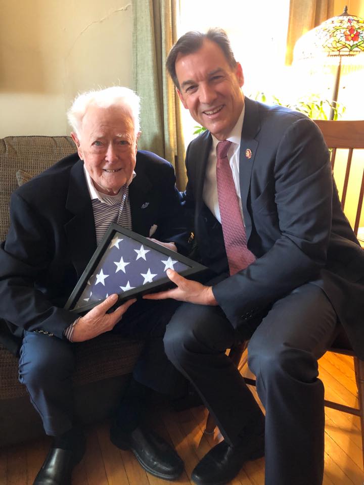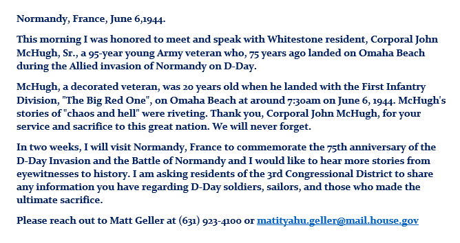 This morning I was honored to meet and speak with Whitestone resident, Corporal John McHugh, Sr., a 95-year young Army veteran who, 75 years ago landed on Omaha Beach during the Allied invasion of Normandy on D-Day.pic.twitter.com/VOaHT4vmHs