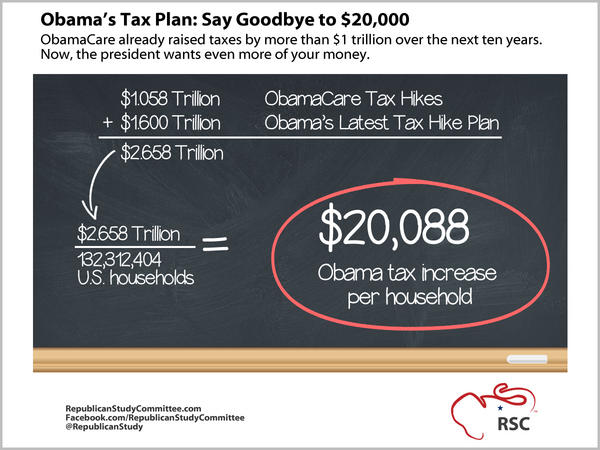 Add the president’s latest tax hike plan to the ObamaCare taxes, and you’re looking at a $20,000 tax hike per family!pic.twitter.com/v1nZGf9z
