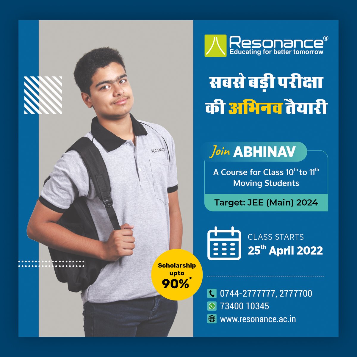 Resonance announces admission to ABHINAV course for JEE Main 2024. For: 10th to 11th moving students Starts: 25th April 2022 Scholarship: upto 90%(via ResoNET)