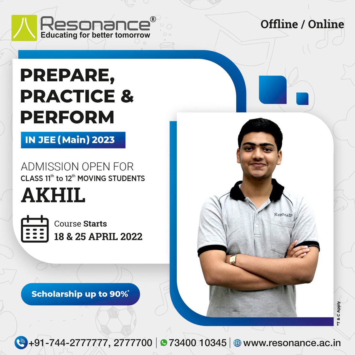 Resonance announces ‘AKHIL’ course for JEE (Main) 2023. For: 11th to 12th moving students Starts from: 18th & 25 April 2022 Scholarship: via ResoNET (upto 90%)