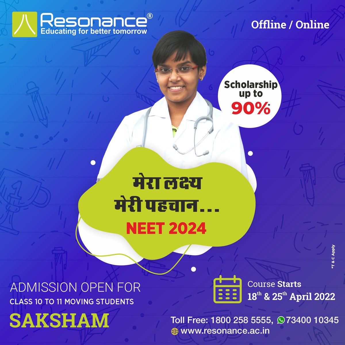 Resonance announces SAKSHAM course for NEET (UG) 2024. For: 10th to 11th moving students Starts from: 18th & 25th 2022 Scholarship: via ResoNET (upto 90%)