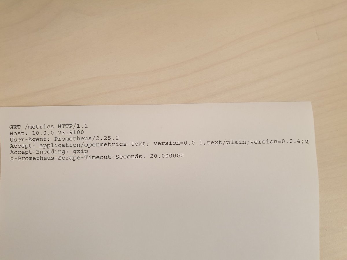 HP Laserjet printer port: 9100 Prometheus node_exporter port: 9100 Probability that someone will mistype the printer IP address into their Prometheus configuration: 100.00000% Perfectly printed HTTP GET request every 15 seconds: yespic.twitter.com/t64z0MZcUh