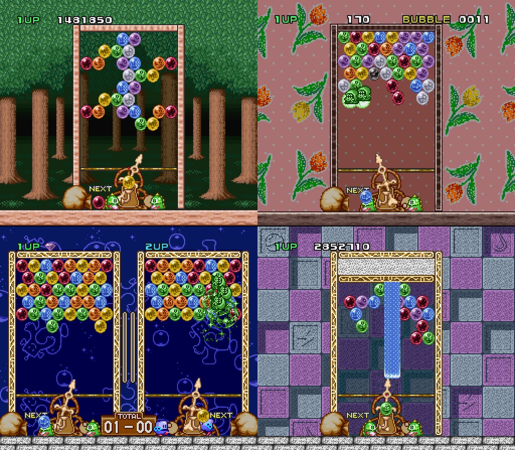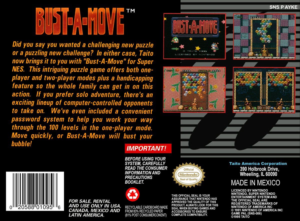 BUST-A-MOVE: In 1995 Super Nintendo gamers got a superb version of the classic 'Puzzle Bobble' arcade game by Taito. With an addictive 2 player option as well as other gameplay modes and more levels this was a must for bubble fans