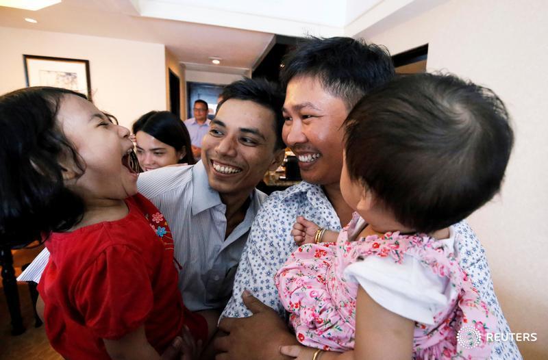 Together at last: @Reuters reporters Wa Lone and Kyaw Soe Oo celebrate with their children after being freed from prison in Myanmar, May 7, 2019. REUTERS/Ann Wangpic.twitter.com/f5ol5LBUJG