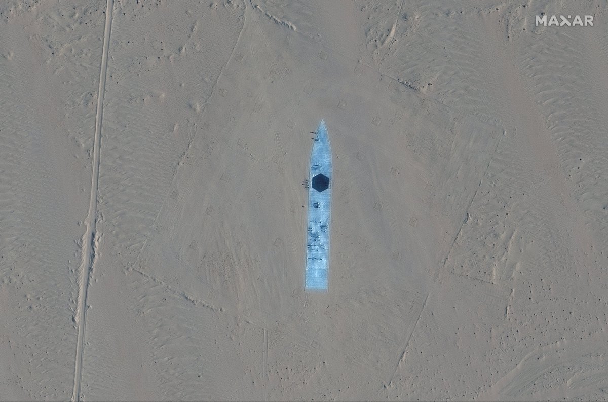 The satellite images showed a full-scale outline of a U.S. carrier and at least two Arleigh Burke-class guided missile destroyers had been built at what appears to be a new target range complex in the Taklamakan Desert 3/6pic.twitter.com/8sr4SKKbc8