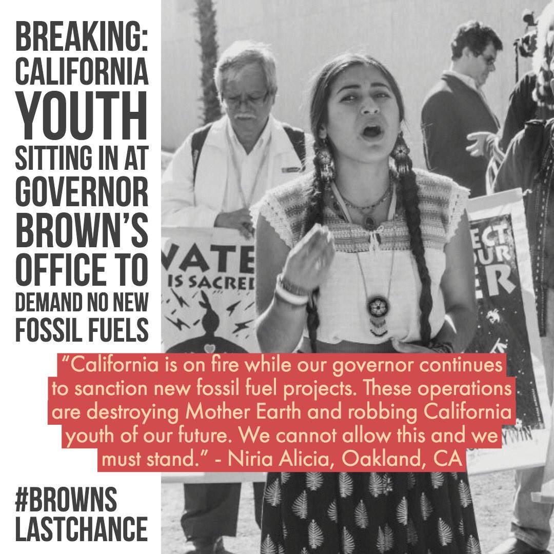 @JerryBrownGov’s office to demand he act on climate in line with *science* and *justice*: NO new fossil fuel projects & a just, rapid transition to renewable energy. WATCH LIVE: https://www.facebook.com/sunrisemvmt/videos/2333253780025836/ …#BrownsLastChance#HeatWeekpic.twitter.com/N4OSxpX1Kq