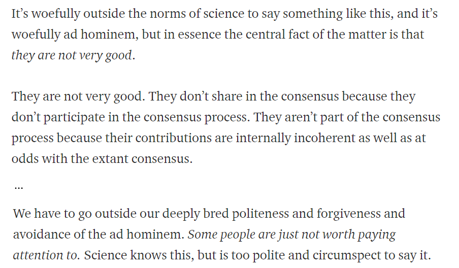 Apparently, science proceeds by mocking and delegitimizing dissenters. There's a long history of this type of scientific condescension aging very poorly. It's a species of the very unfortunate "My opponent isn't just wrong - he's evil!" argument. Shouldn't that be avoided?pic.twitter.com/UtGYD79qAu