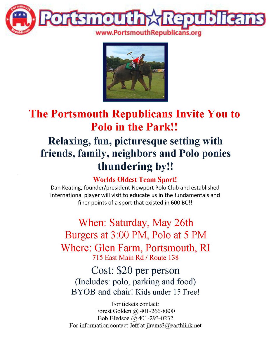 SATURDAY: @PortsmouthRIGOP annual Polo is Saturday May 26th at Glen Farm Portsmouth - $20 per person (Includes: polo, parking, food and door prizes) BYOB and chairs. Kids under 15 free. Fun and food begins at 4PM http://ow.ly/awbv30jN3M1 pic.twitter.com/VeGRxmj3R1