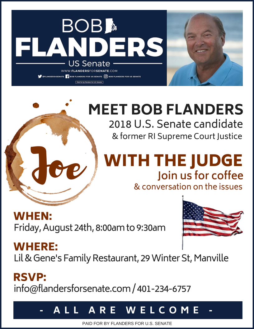 FRIDAY MORNING COFFEE AND CONVERSATION: Joe With the Judge - Bob Flanders for U.S. Senate - Friday, August 31st - 8:00 – 9:30am - Lil and Gene's Family Restaurant - Manville ( in Lincoln )