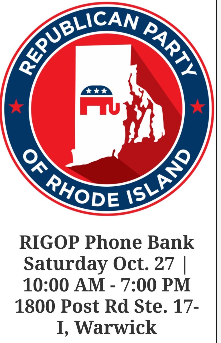 Today is TEN DAYS away from the Rhode Island General Election!! Can you believe it?! Join our Republican Victory Team for a day of Phone Banking at RIGOP HQ from 10:00 AM to 7:00 PM. TODAY !! SATURDAY, OCTOBER 27TH !!pic.twitter.com/dJqplNbEIq