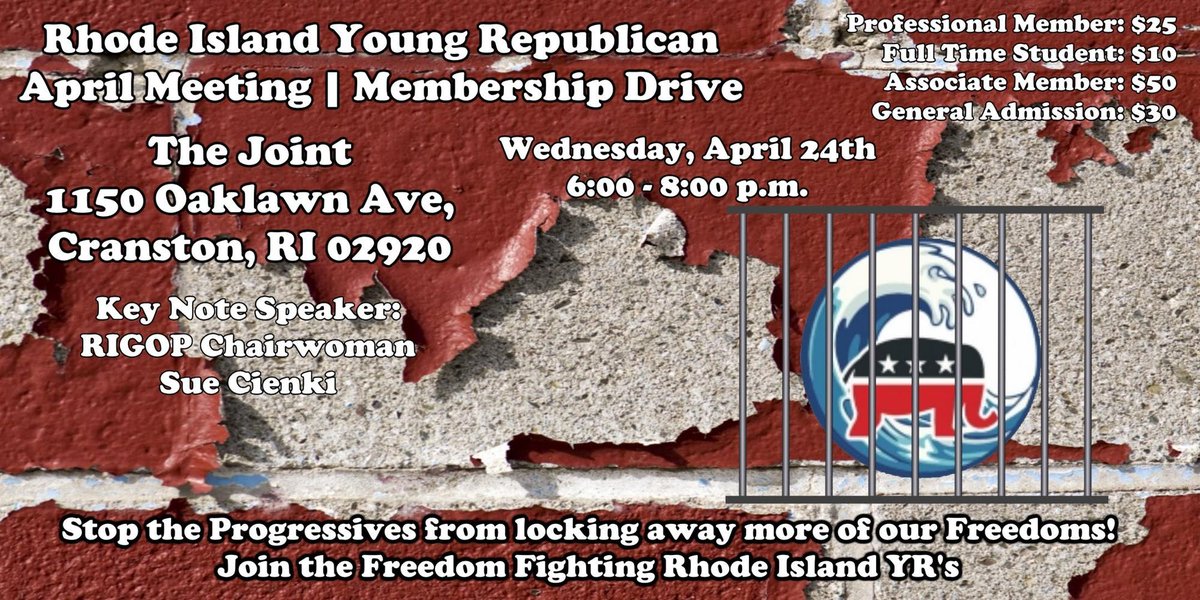 Rhode Island Young Republican April Meeting/Membership Drive -Wednesday, April 24th at The Joint in Cranston. http://ow.ly/dZWd30omSK4 @YoungGOP401 @RIHouseGOP @yrnfpic.twitter.com/ywTuHFdFkD