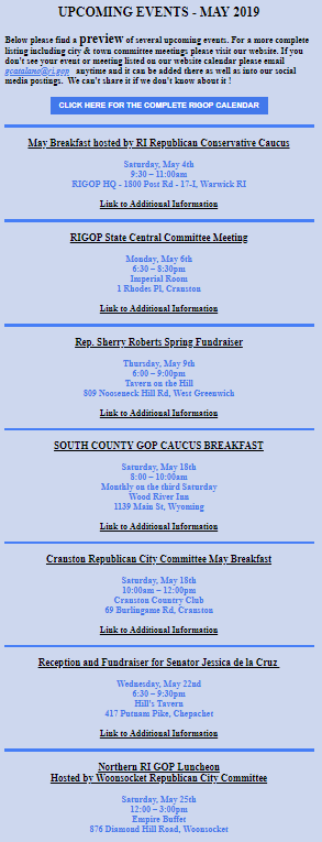 Rhode Island Republican Party - May 2019 Events & Meetings - May Breakfasts, Luncheons, Fundraisers, Meetings and More !! http://ow.ly/HPLH50t8quZ pic.twitter.com/izUjWJOQ1d