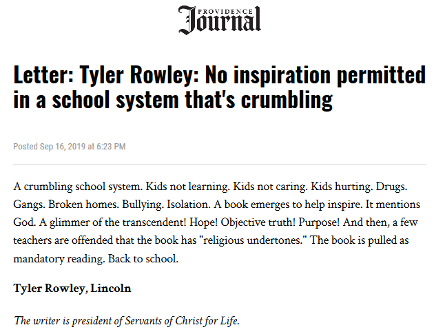 Letter: Tyler Rowley: No inspiration permitted in a school system that's crumbling Tyler Rowley, Lincoln The writer is president of Servants of Christ for Life. https://www.providencejournal.com/opinion/20190916/letter-tyler-rowley-no-inspiration-permitted-in-school-system-thats-crumbling?template=ampart …pic.twitter.com/jxiLrOPhOH