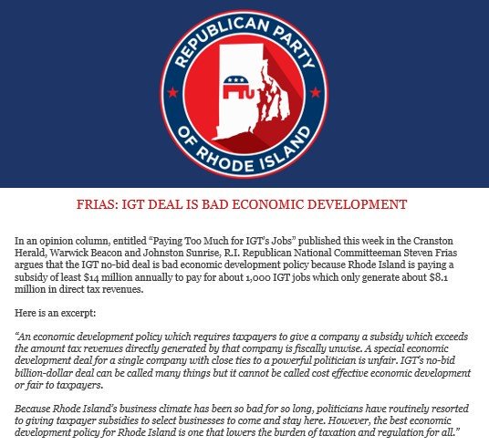 R.I. Republican National Committeeman Steven Frias argues that the IGT no-bid deal is bad economic development policy because Rhode Island is paying a subsidy of least $14M annually to pay for about 1,000 IGT jobs which only generate about $8.1M in direct tax revenues.pic.twitter.com/p1kJkwwdfW