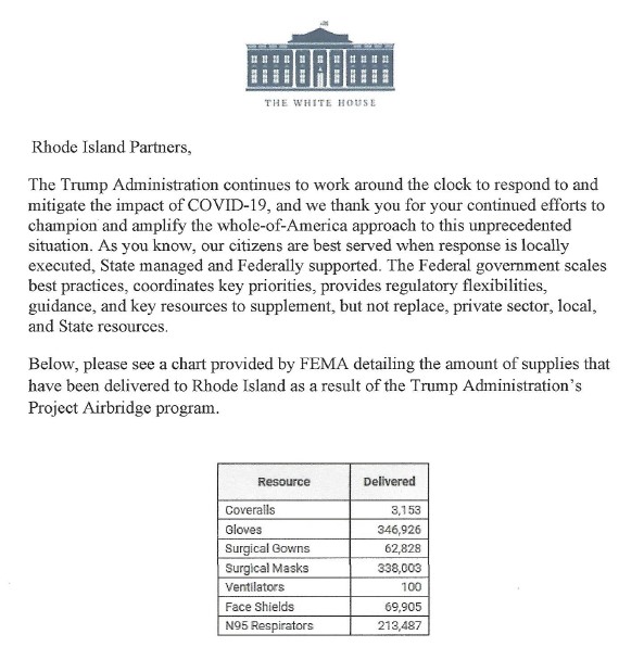 The Trump Administration continues to work around the clock to respond to and mitigate the impact of COVID-19, and we thank you for your continued efforts to champion and amplify the whole-of-America approach to this unprecedented situation. Chart shows supplies delivered to RIpic.twitter.com/7vXCcbLh1t