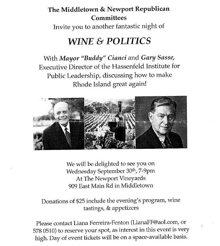 Newport/Middletown RIGOP Invite you to Wine & Politics with "Buddy" Cianci & @gsasse - 9/30 at Newport Vineyards !pic.twitter.com/5ynyl5giFA