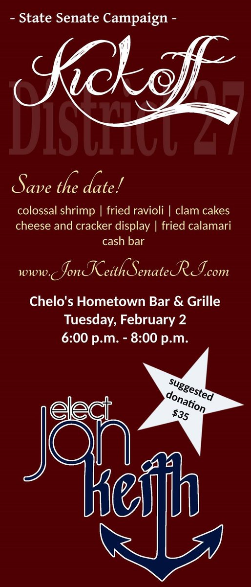 RT @jkeithsenateri: Join us at @ChelosBarGrille on Feb 2 for our #RISenate campaign kickoff! #JonKeithSenateRI #RIpic.twitter.com/TGOOV9EN4H