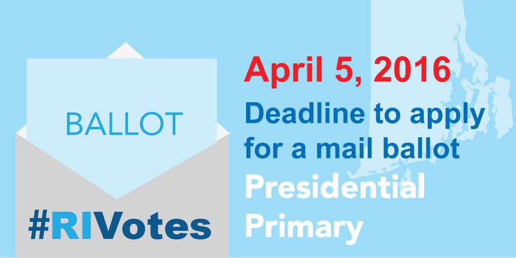 RT @RISecState: 1 day left to apply for a mail ballot for April 26 Presidential Primary. http://sos.ri.gov/divisions/elections/Voters/vote-by-mail …pic.twitter.com/NgNMCVjLcU