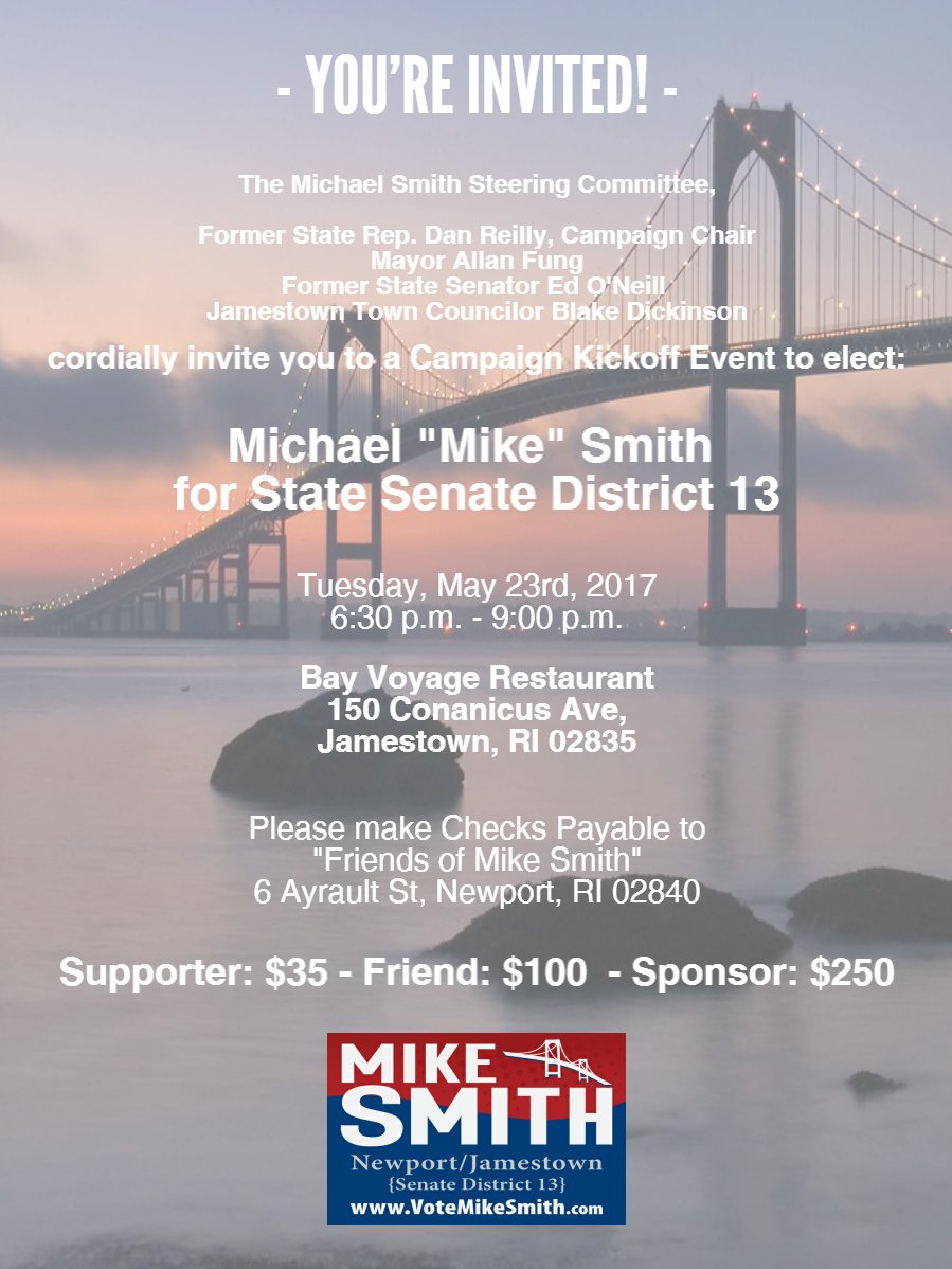 EVENT: Mike Smith for State Senate District 13 Campaign Kickoff - @VoteMikeSmith May, 23rd http://ow.ly/amhg30bNt3r @RISenatepic.twitter.com/4P54O7Zc1U