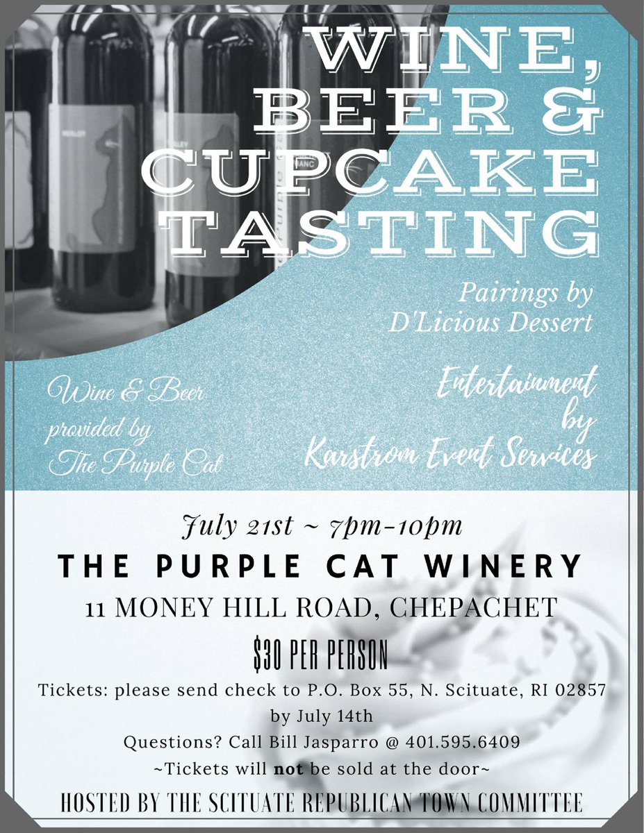 EVENT: Scituate GOP - Wine, Beer and Cupcake Tasting !! - Friday, July 21st - 7pm - @PurpleCatWinery. @rihousegoppic.twitter.com/qz7cBFKk9a