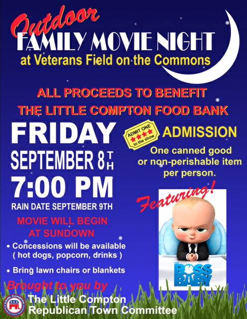 EVENT: Family Movie Night Sponsored by The Little Compton Republican Town Committee - Friday, September 8th - Veterans Field on the Commonspic.twitter.com/8UT7gPWmDx