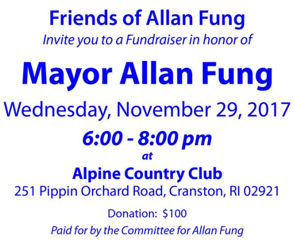 EVENT: Friends of Fung - Fundraiser for @MayorFung Wednesday, November 29th - 6:00pm – 8:00pm Alpine Country Club Cranston, RIpic.twitter.com/MA1hD8thCo